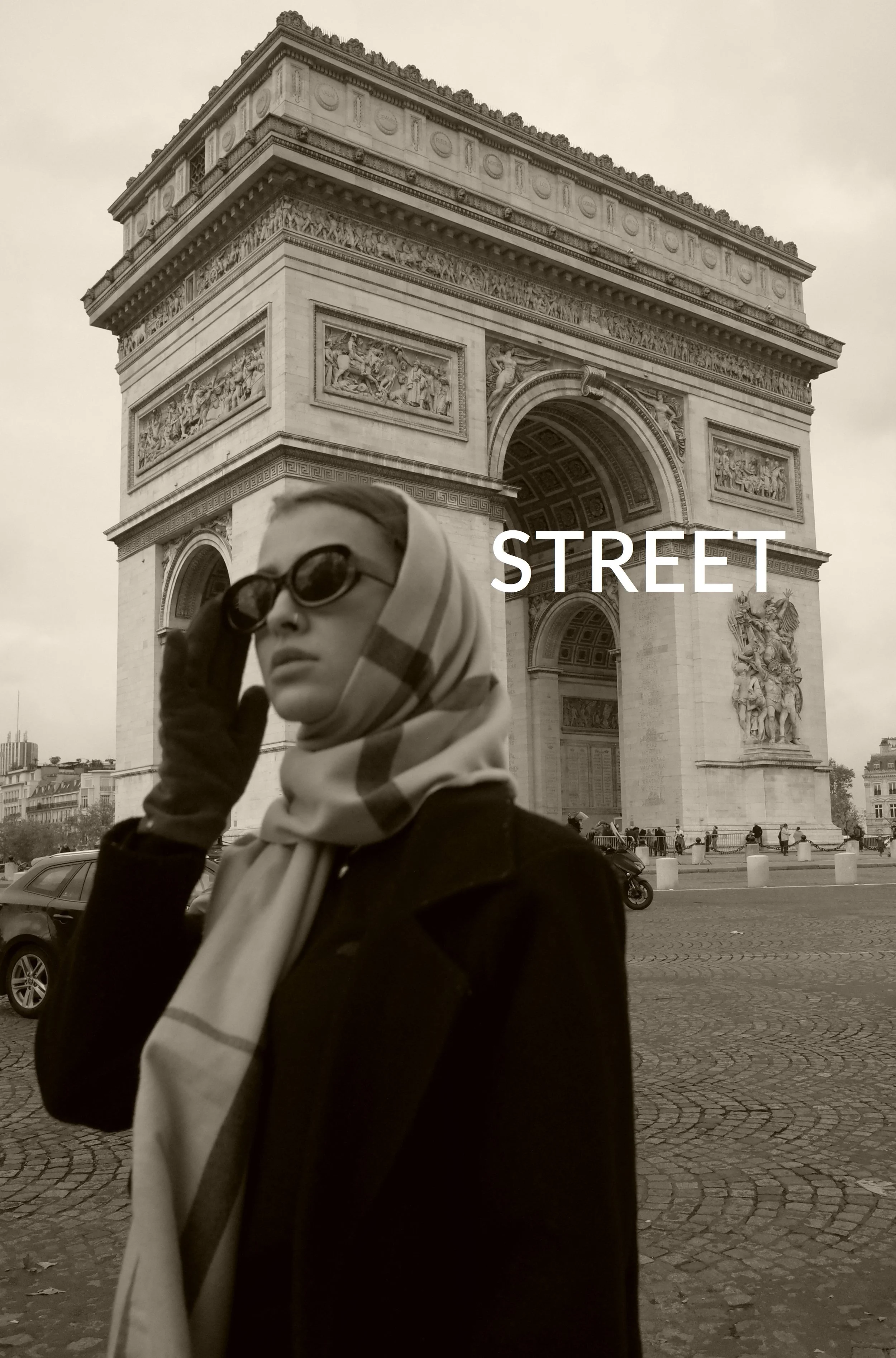 A woman wearing sunglasses, a headscarf, and a coat standing in front of the Arc de Triomphe in Paris, France. The word 'STREET' is overlaid on the image.