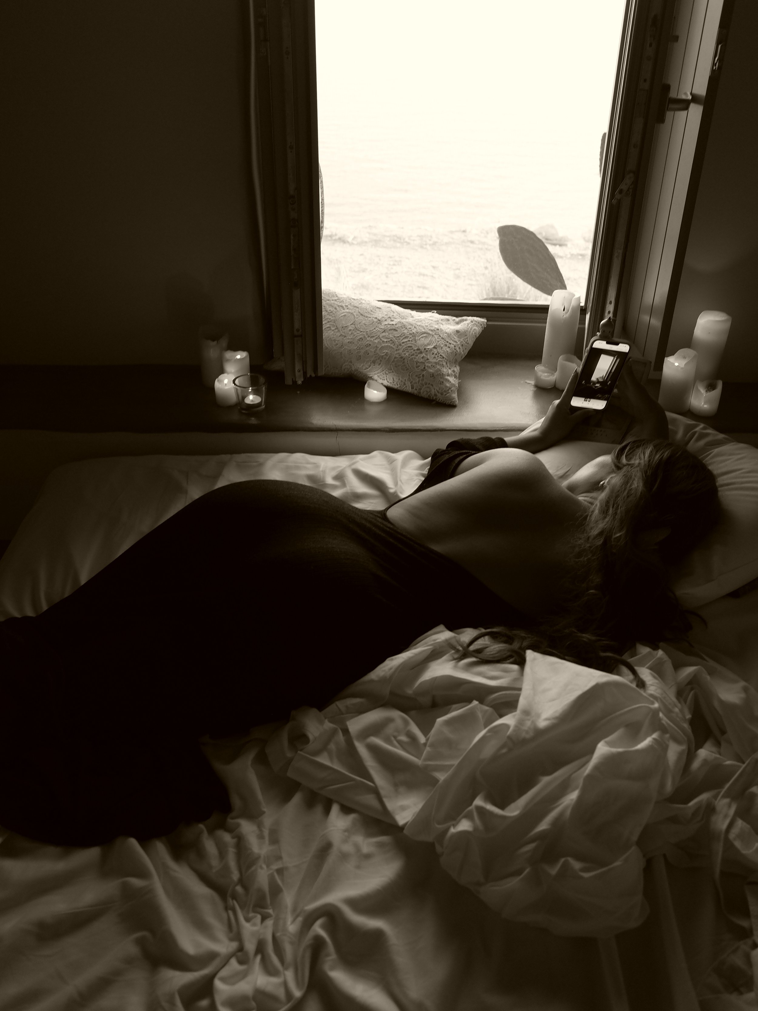 A woman lying on a bed, taking a selfie with her phone. The bed is next to a window with candles and a pillow on the windowsill, and the scene appears to be overlooking a body of water.