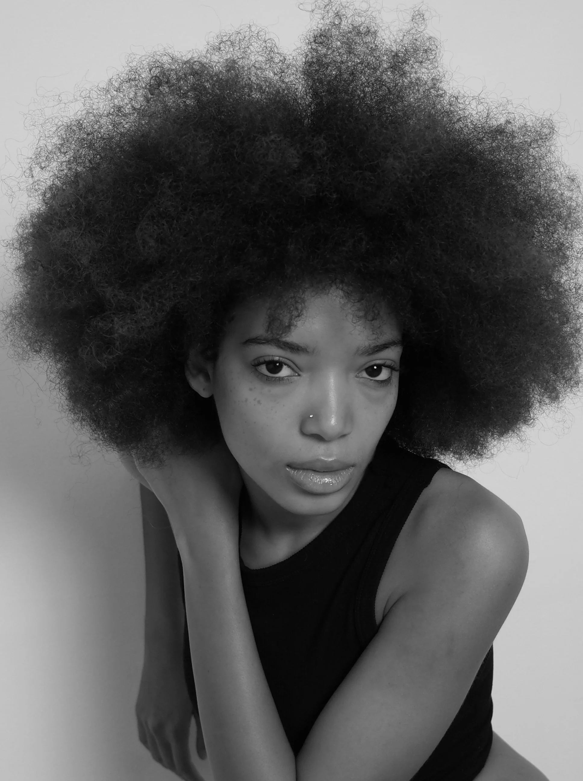 Black and white portrait of a young woman with an afro hairstyle, wearing a sleeveless top, touching her neck with one hand, looking at the camera with a neutral expression.
