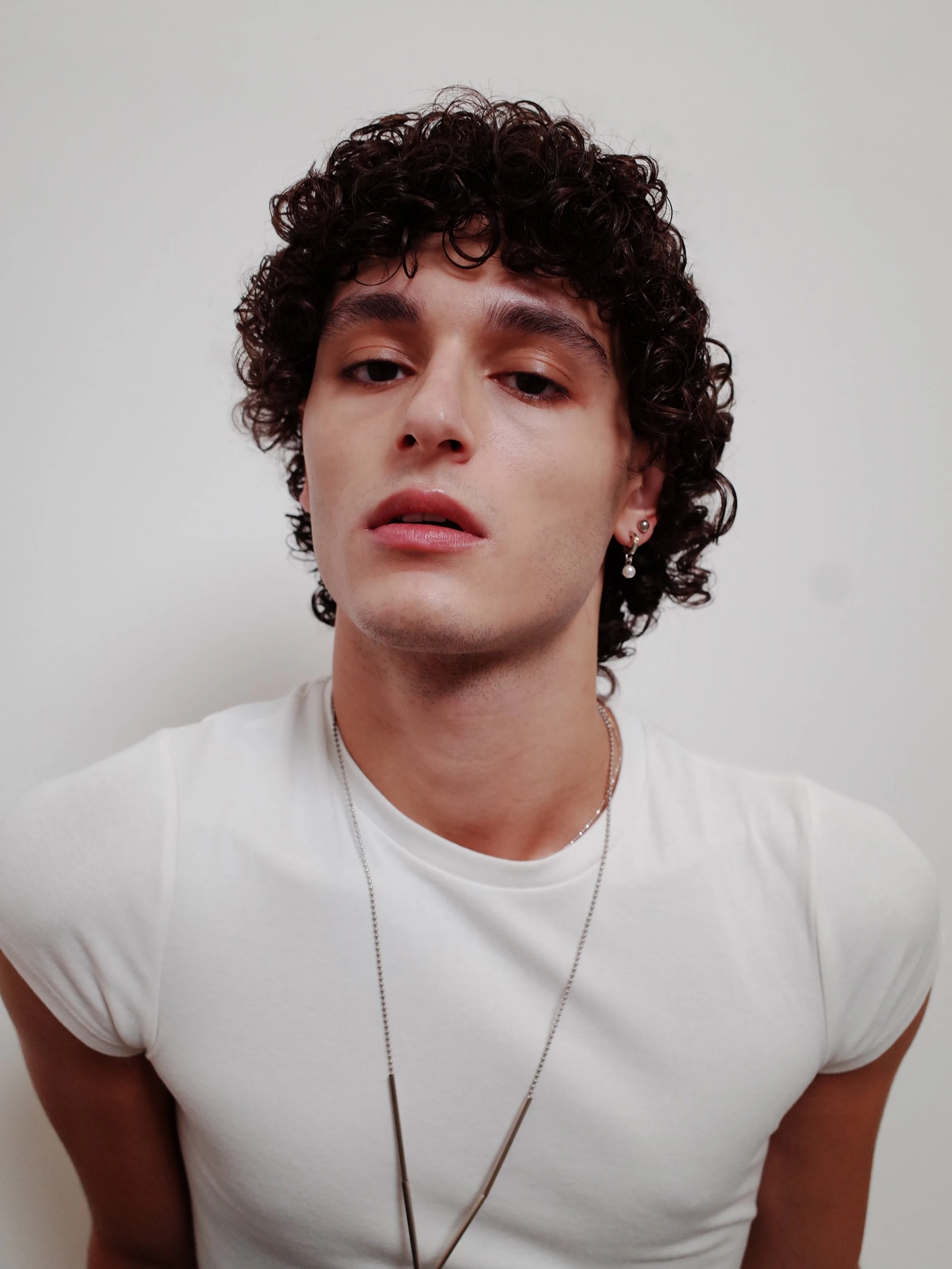 A young man with curly dark hair wearing a white t-shirt, earrings, and necklaces, standing against a plain light gray background.