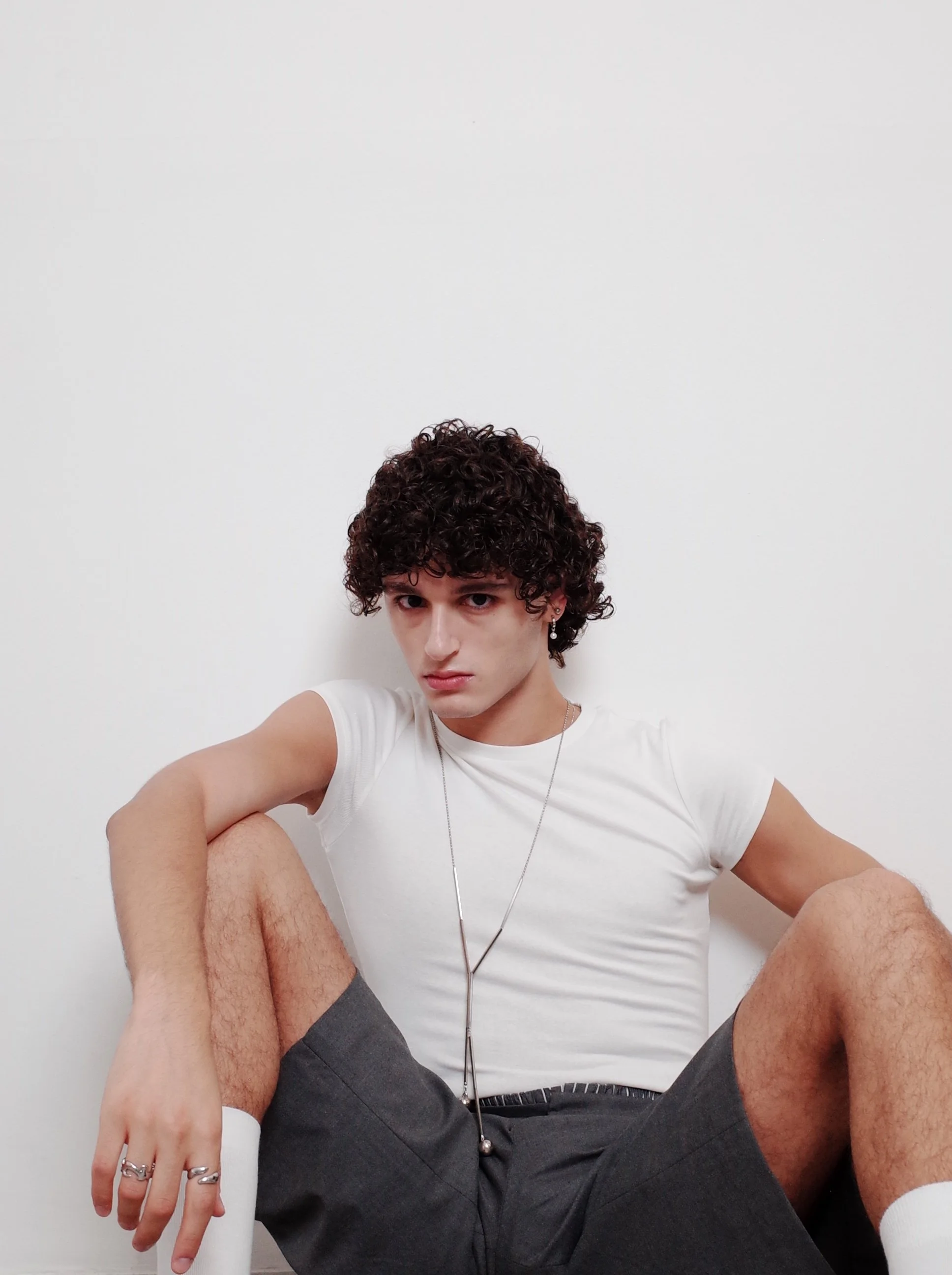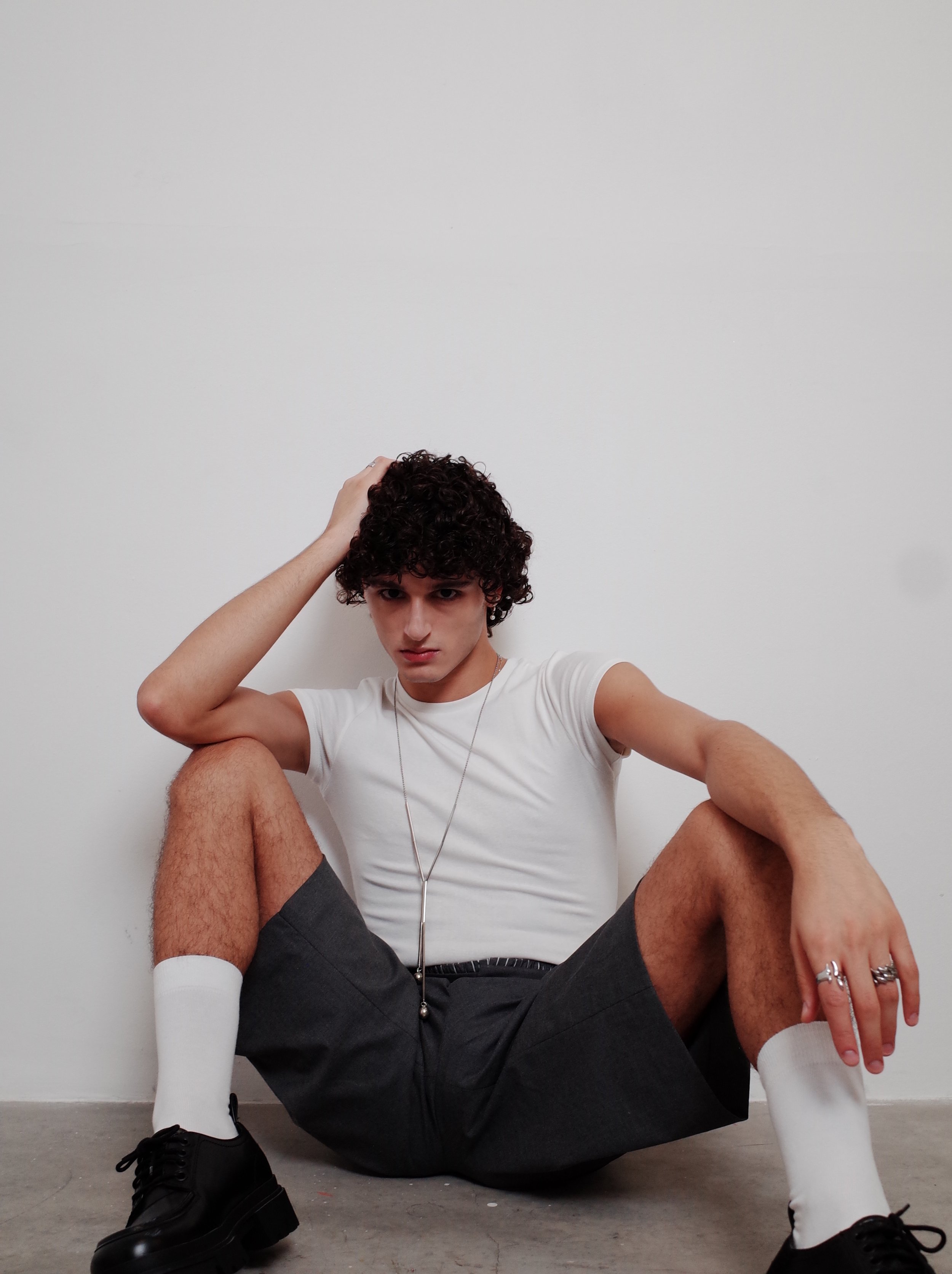 Young man with curly hair sitting on the floor against a plain white wall, wearing a white t-shirt, dark shorts, white socks, and black shoes, with rings on his fingers and a long necklace, looking directly at the camera with a serious expression, with one hand on his head and the other resting on his knee.