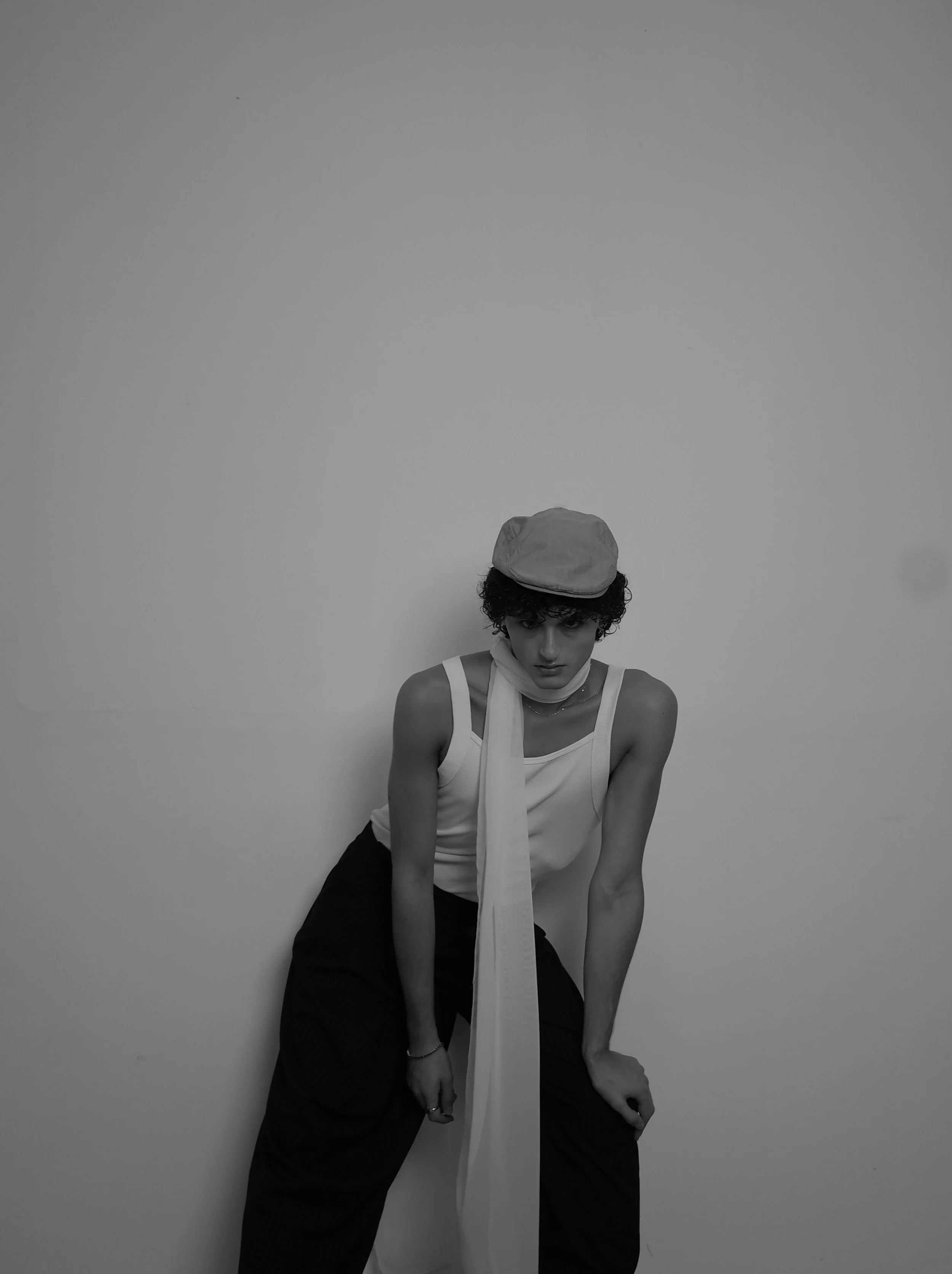 A young person with short, curly hair wearing a light-colored cap, white tank top, dark pants, and a long scarf, standing against a plain wall.