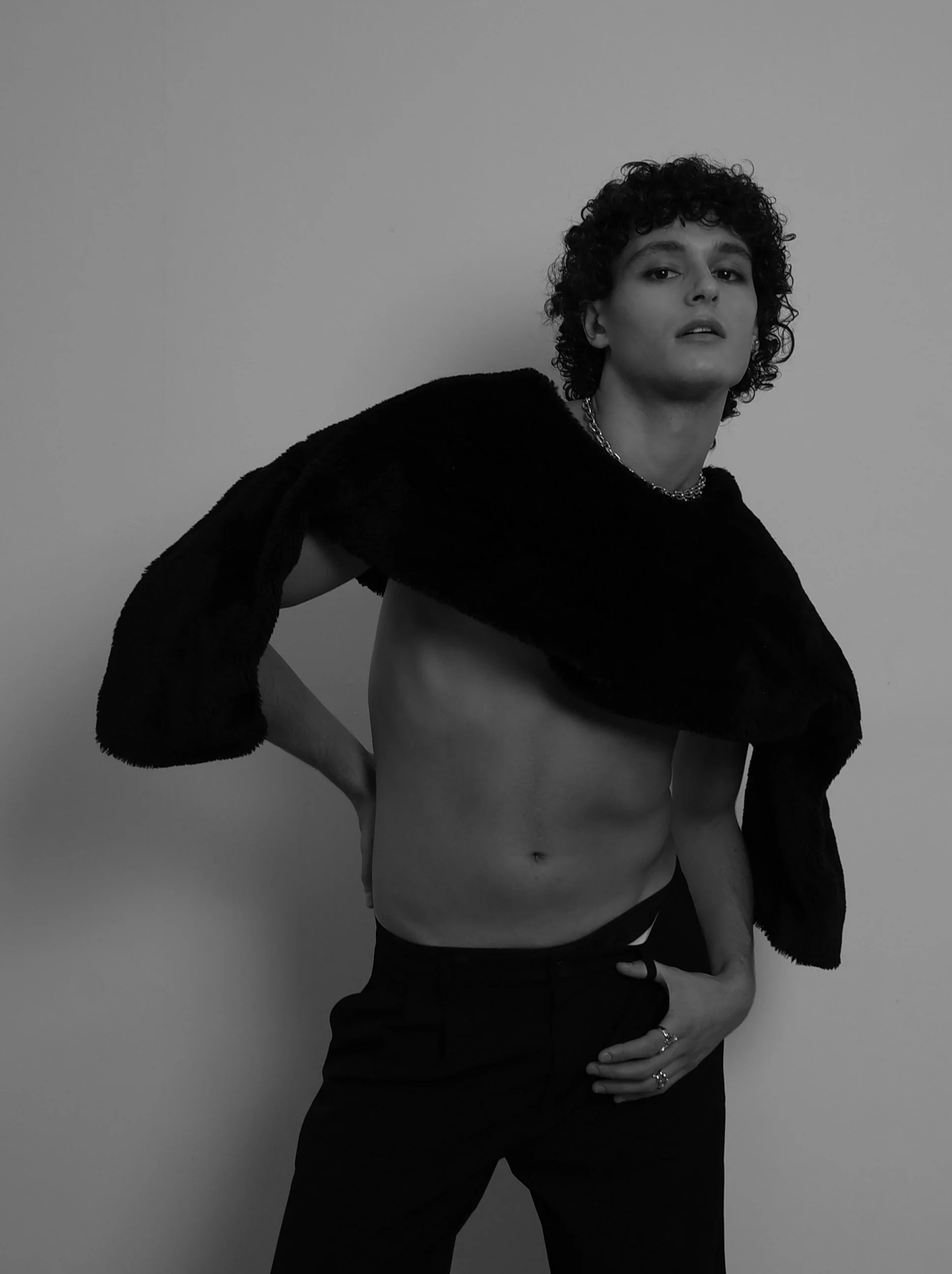 A person with curly hair wearing dark pants, a chain necklace, and a black fluffy jacket draped over shoulders, standing against a plain light-colored background, posing with one hand on their hip and the other behind their back.
