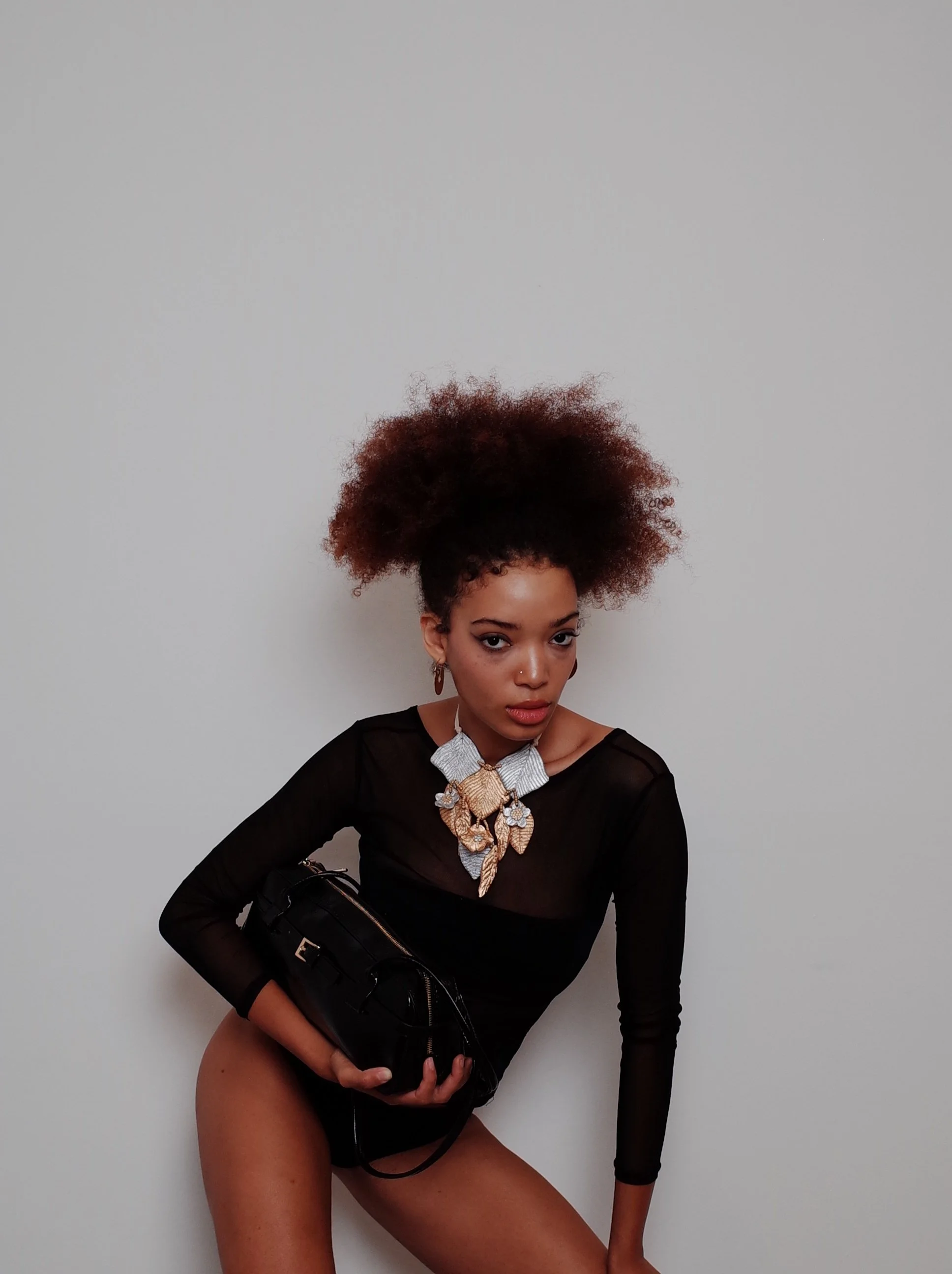 A woman with curly brown hair styled in an afro pose against a plain wall. She is wearing a sheer black top, holding a black handbag, and accessorized with large statement jewelry, including earrings and a necklace.